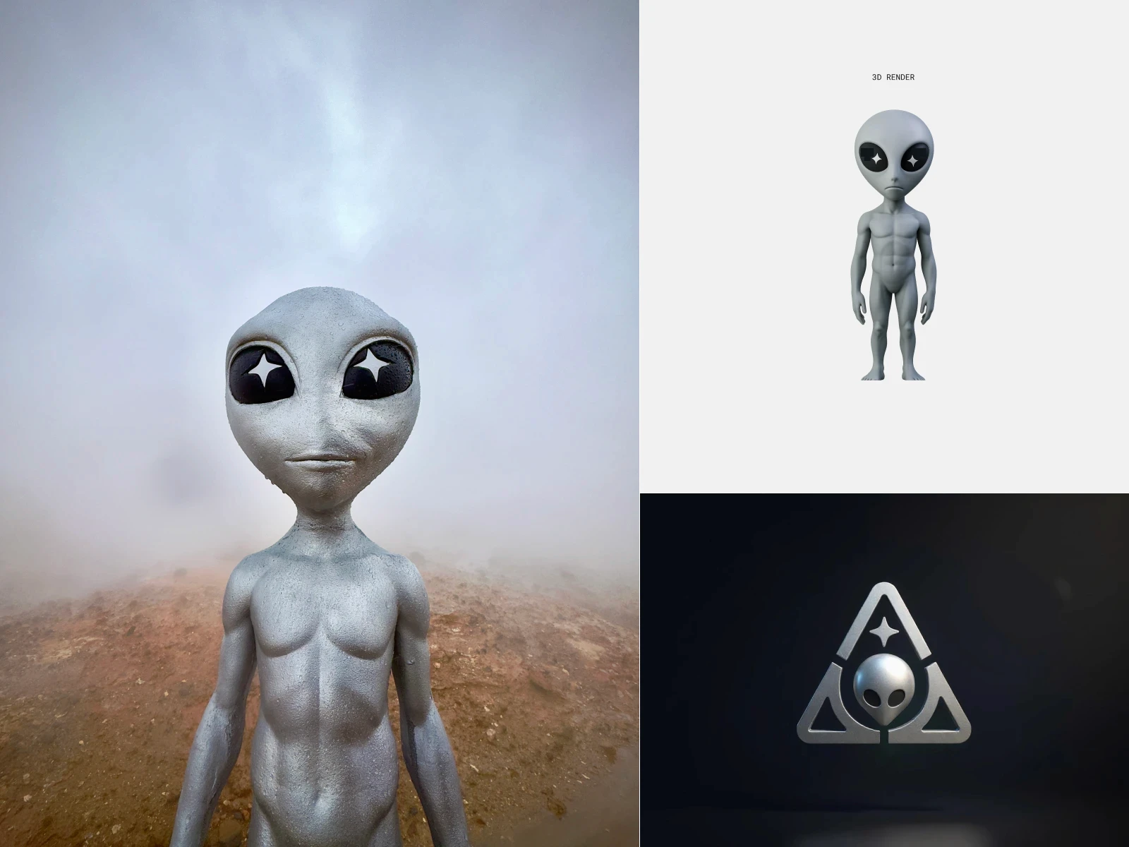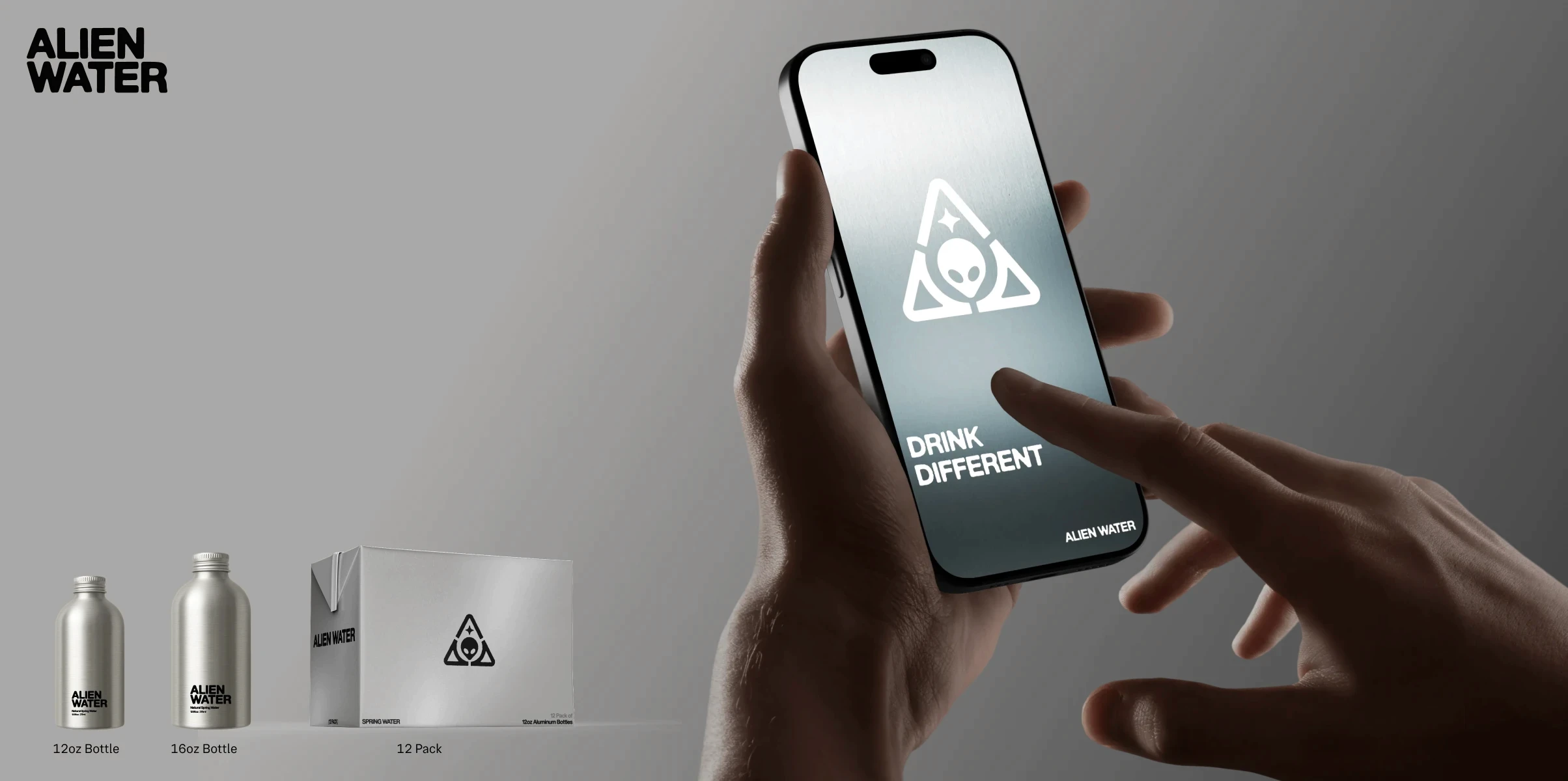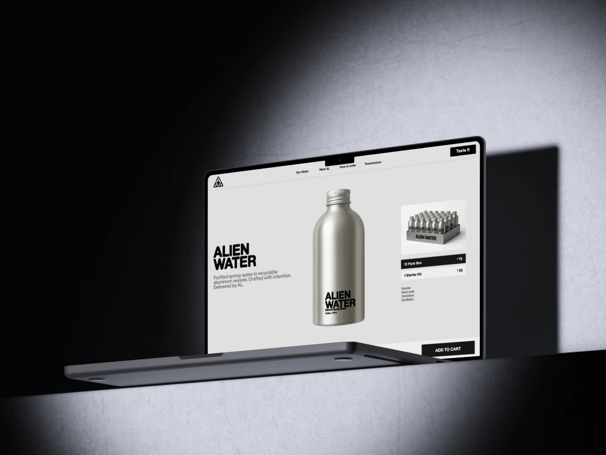 Full brand identity, packaging design, and web experience for a water brand built on a simple premise: drink different. Chrome and silver. Alien iconography that doesn't take itself too seriously. "He came to share something better."