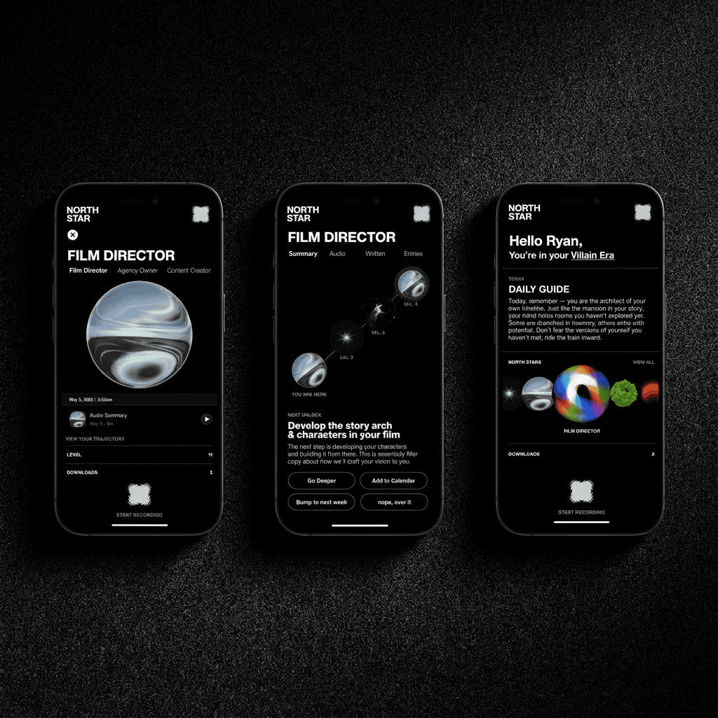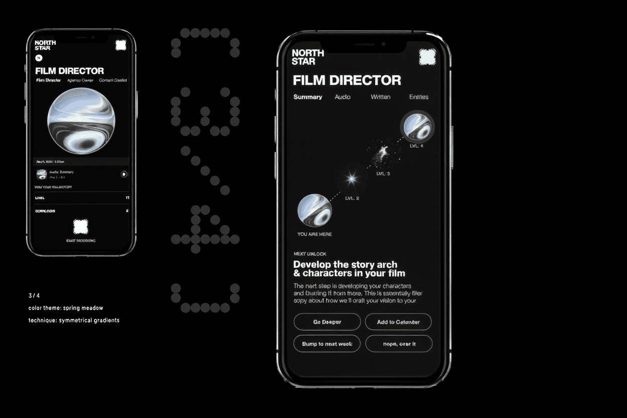 Product design and brand identity for a mindfulness and productivity app. Home screens, daily focus flows, feed content modules, and film direction features. Dark mode. Cosmic gradients. Named for navigation.